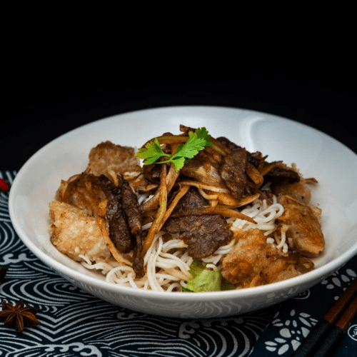 Grilled beef on rice vermicelli. Served with peanut